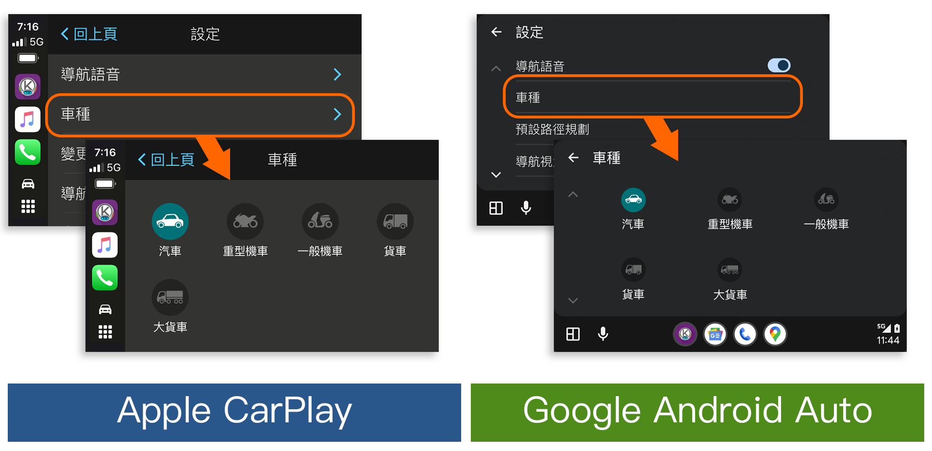 這項功能調整也支援 Apple CarPlay 與 Android Auto!配合車載系統介面呈現,連接車載後,你可以在車載螢幕上,點擊地圖上的「設定」,進入「車種」設定頁,輕鬆切換車種。