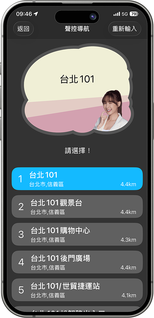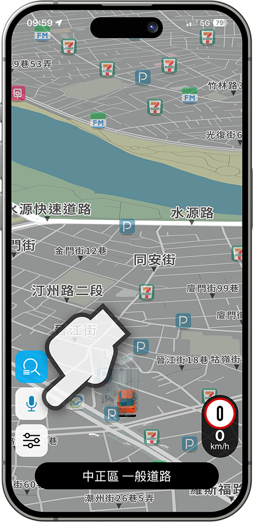 - 點選地圖上的「麥克風」圖示按鈕,即可進入聲控畫面開始使用。系統會依據您在設定中的播報語言設定,提供對應的互動語音。